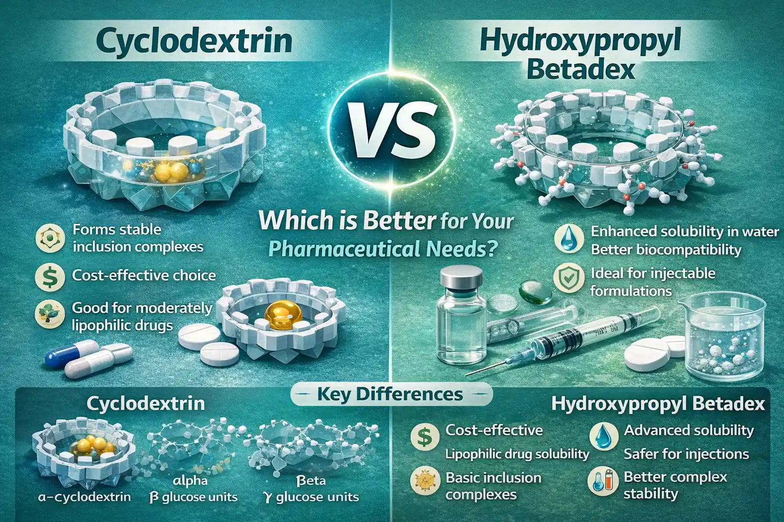 Коли справа доходить до фармацевтичного використання, циклодекстрин ігідроксипропілбетадексобидва по-своєму підходять для методів доставки ліків. Стандартні циклодекстрини добре охоплюють молекули та є економічно ефективними. З іншого боку, гідроксипропілбетадекс краще розчиняється у воді та є більш біосумісним. Вибір залежить від потреб вашої рецептури, причому гідроксипропілбетадекс забезпечує суттєве покращення розчинності складних молекул ліків, а циклодекстрини перевершують основні комплекси включення.