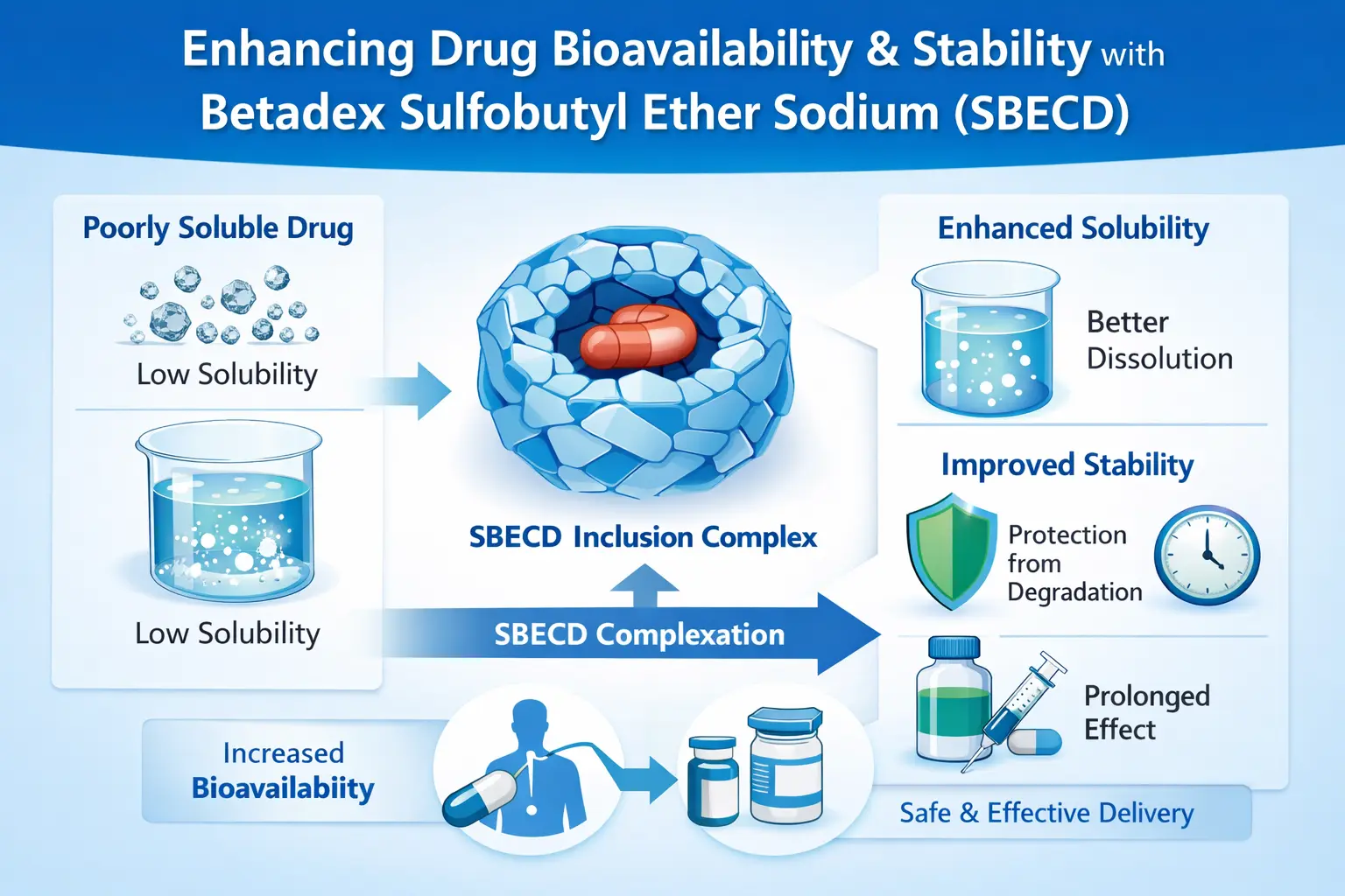 Бетадекс Сульфобутиловий ефір натрію (SBECD) змінює спосіб виготовлення ліків шляхом поєднання з препаратами, які погано розчиняються. Це похідне циклодекстрину покращує біодоступність, охоплюючи молекули, завдяки чому деякі хімічні речовини розчиняються у воді до 1000 разів краще. Підвищення стабільності відбувається тому, що SBECD запобігає розпаду молекул ліків, зберігаючи при цьому ефективність лікування. Як допоміжна речовина, схвалена FDA, SBECD дає змогу вводити ліки через рот, що раніше було неможливо. Особливо це стосується протигрибкових, противірусних та онкологічних препаратів.