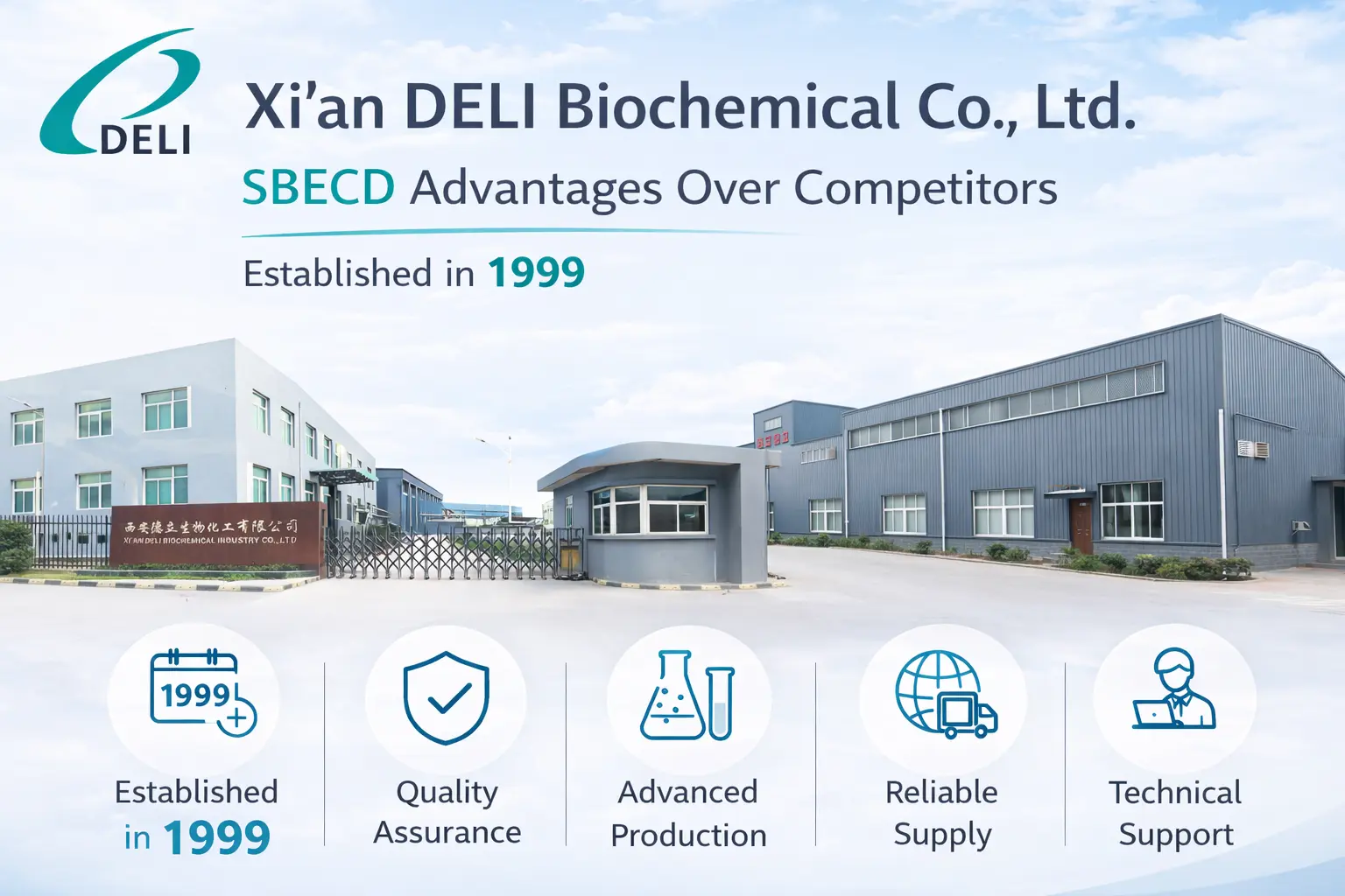 DELI Biochemical є однією з найбільших компаній, що виробляє Betadex Sulfobutyle Ether Sodium. Вони виготовляють інгредієнти для ін’єкцій, які відповідають найсуворішим медичним стандартам. Ми є найкращим партнером для розробки нових ліків, тому що дбаємо про якість, надійність і задоволеність споживачів. Ви можете отримати перевагу DELI завдяки нашій повній технічній підтримці та гарантованій надійності поставок. Зв’яжіться з нами за адресою xadl@xadl.com, щоб обговорити ваші конкретні потреби щодо формулювання.