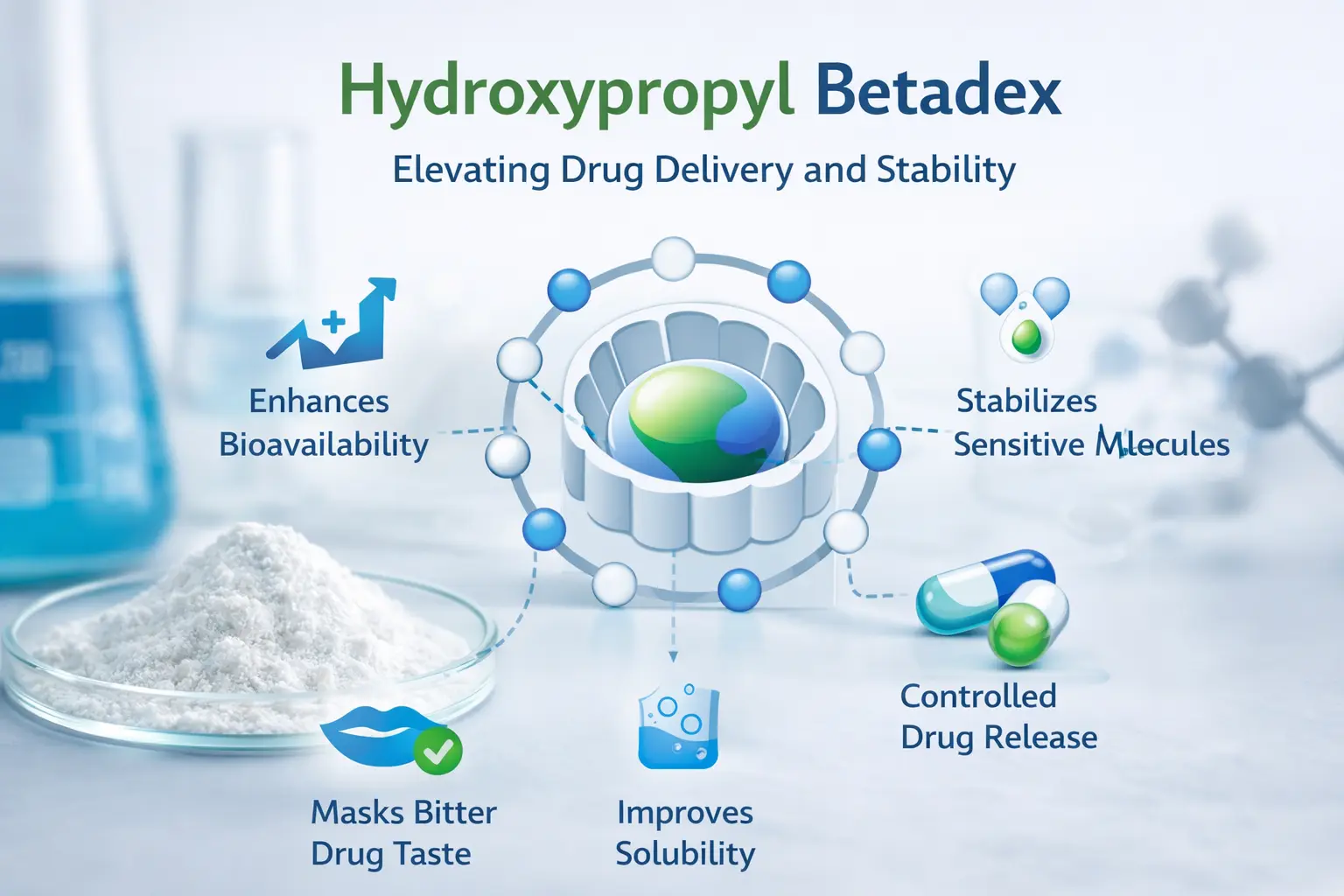 Завдяки контрольованому вивільненню розробники можуть змінювати спосіб випуску ліків без використання складних методів доставки. Hydroxypropyl Betadex може змінювати спосіб взаємодії молекули-гостя з молекулою-господарем для досягнення миттєвого, тривалого або спрямованого вивільнення. Ця універсальність скорочує час, необхідний для створення нових ліків, і полегшує пацієнтам дотримання своїх планів дозування, що покращує комплаєнс.