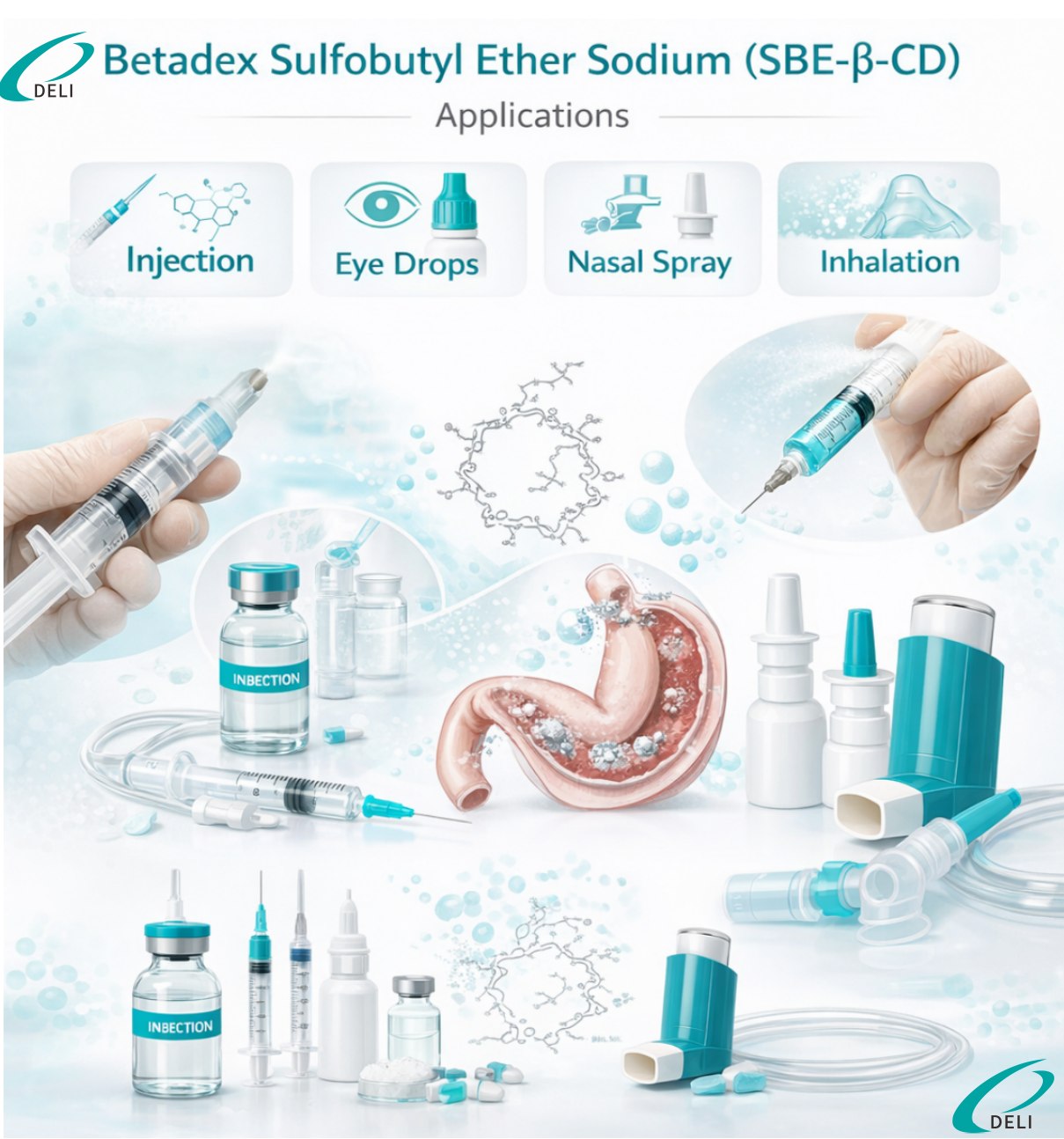 Сульфобутиловий ефір бета-циклодекстрину натрію для ін’єкцій – це високорозчинна у воді аніонна похідна циклодекстрину, розроблена для фармацевтичного застосування. Цей продукт, виготовлений компанією Xi’an DELI Biochemical Industry Co., Ltd., широко використовується як фармацевтична допоміжна речовина для підвищення розчинності, стабільності та безпеки слаборозчинних у воді активних фармацевтичних інгредієнтів (API), особливо в ін’єкційних формах.
