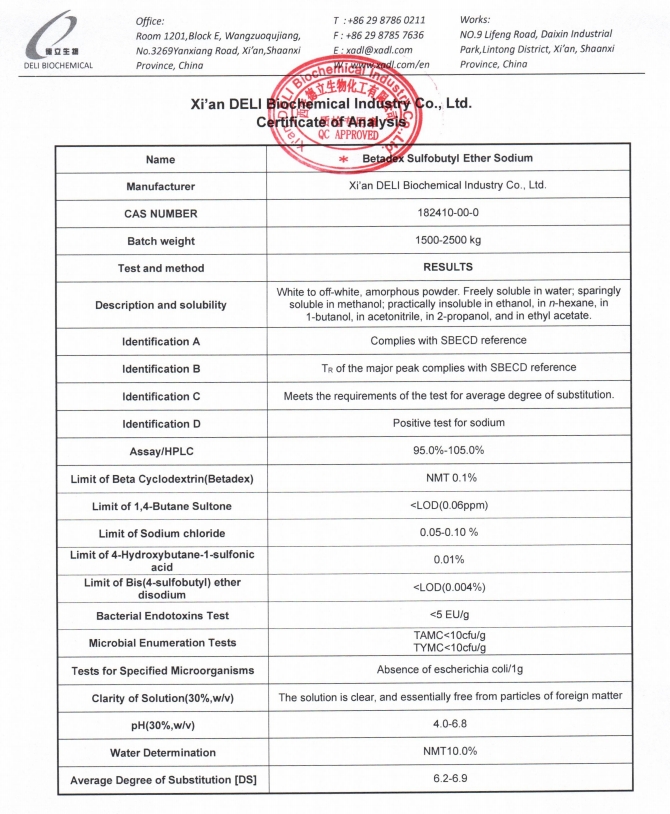 Цей ін’єкційний сульфобутиловий ефір бета-циклодекстрин натрію виробляється відповідно до комплексної системи управління якістю. Ключові параметри якості, включаючи ідентифікацію, аналіз, середній ступінь заміщення, залишкові домішки, рівні ендотоксинів і мікробні обмеження, суворо контролюються.